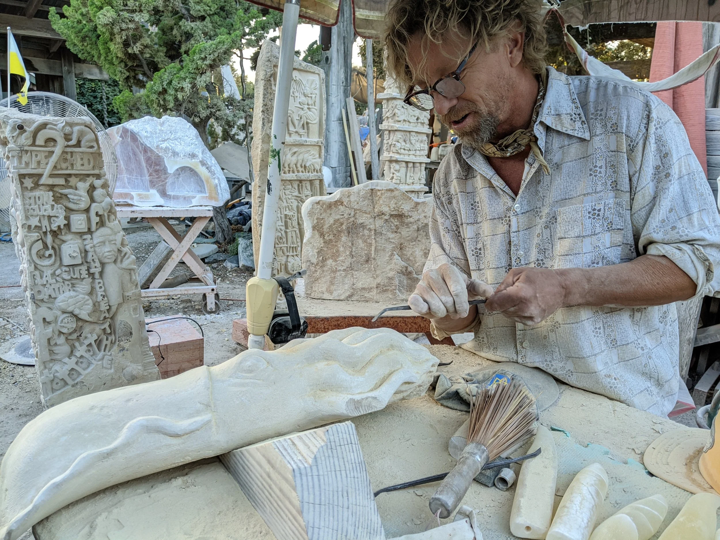 The three limestone totems for “Free Speech’ were carved over a period of ten years, beginning in 2010…